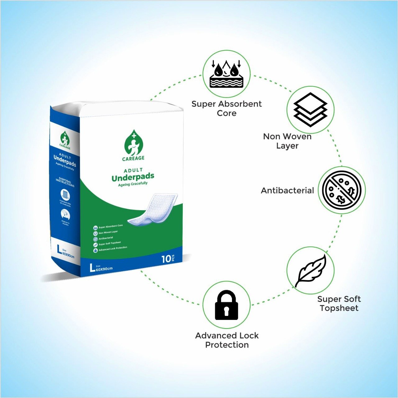 CAREAGE Premium Adult Underpads are designed to deliver reliable protection and superior comfort for adults dealing with incontinence, reduced mobility, or long-term bed rest. With a highly absorbent core that quickly locks in moisture, these underpads help keep bedding and furniture dry and clean. The soft, skin-friendly top layer is gentle enough for daily or overnight use, while the waterproof backing prevents leaks and stains, ensuring a hygienic environment whether used at home, in hospitals, or while traveling. Built-in odour control helps maintain freshness, and the disposable, single-use design makes cleanup quick and convenient. Ideal for both caregivers and individuals, CAREAGE Underpads offer dependable protection that supports comfort, cleanliness, and peace of mind in every situation.